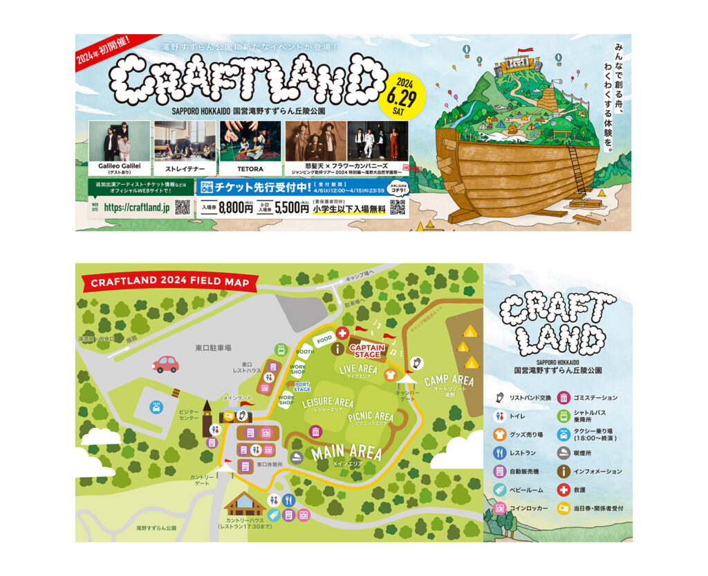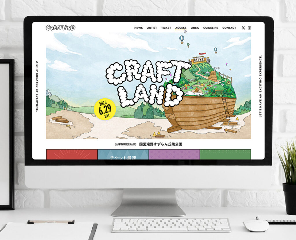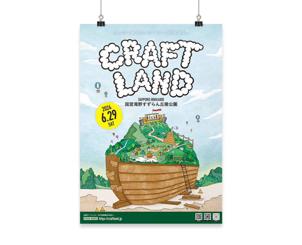 2024年に立ち上がった北海道の野外イベント『CRAFT LAND』のロゴ・Webサイト・Tシャツ・ポスター・会場MAP・駅ナカポスターや会場のお店の看板など、デザイン一式を制作させていただきました。イベントの立ち上げに携わることができ、夢のようでした。